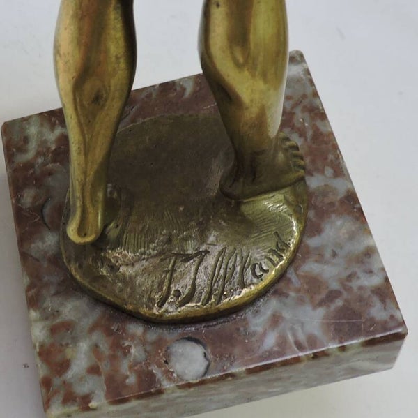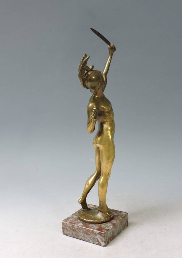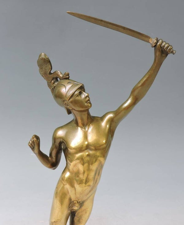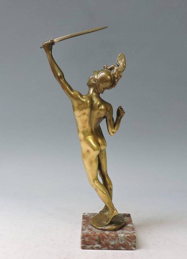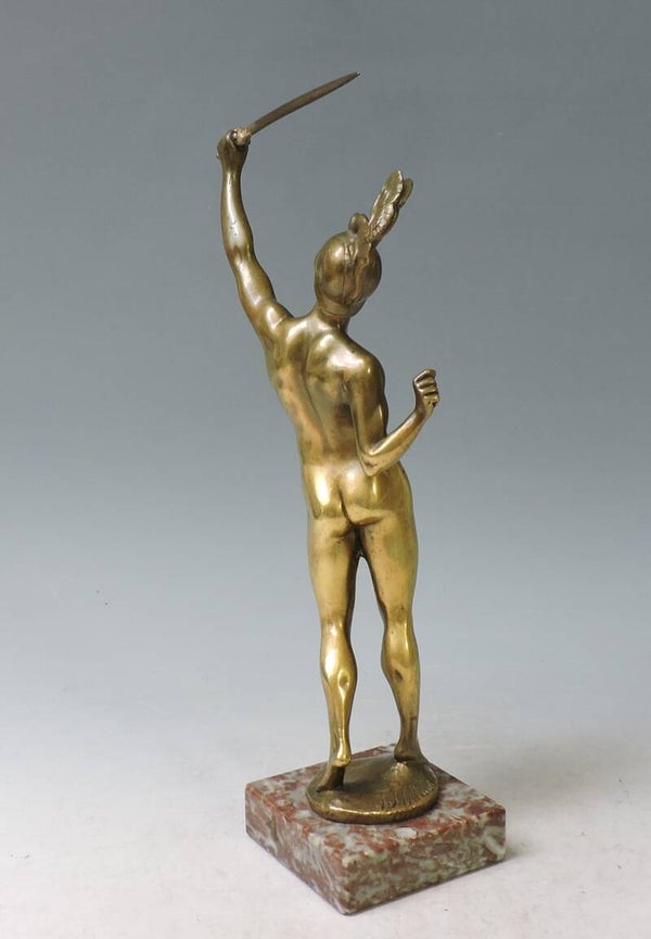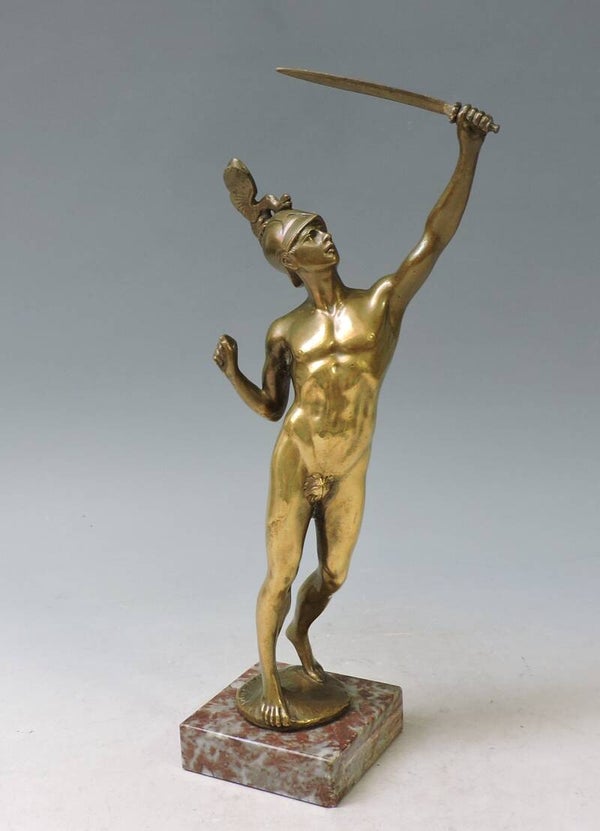 Traumhafte und vor allem äußerst seltene vergoldete Bronzestatue in Form eines nackten, nur mit Feigenblatt bedecktem Krieger. Die von dem renommierten Bildhauer Franz Iffland entworfene Plastik zeigt sich in sehr hochwertiger, kunstvoller Ausarbeitung. Das sensationelle Kunstwerk wurde auf einem flachen Marmorsockel platziert. Besonders die meisterliche Ausarbeitung der Details und die äußerst realistische Proportion machen das Stück zu einem Kunstwerk. Signiert auf der Plinthe mit Iffland und dem Bildgießereizeichen D. Das äußerst seltene Stück ist im altersgemäß sehr guten Zustand, keine Beschädigungen oder Ähnliches, das Schwert ist wohl nicht Original und ersetzt einen Bogen den der Krieger mal in der Hand hielt. Was nicht offensichtlich erscheint und der Schönheit noch einen Besonderen Ausdruck bringt.