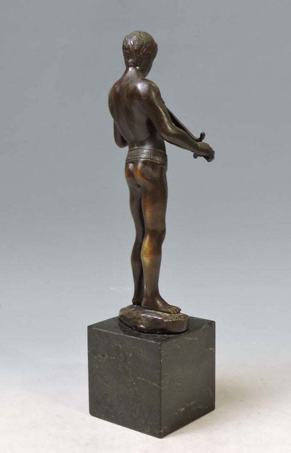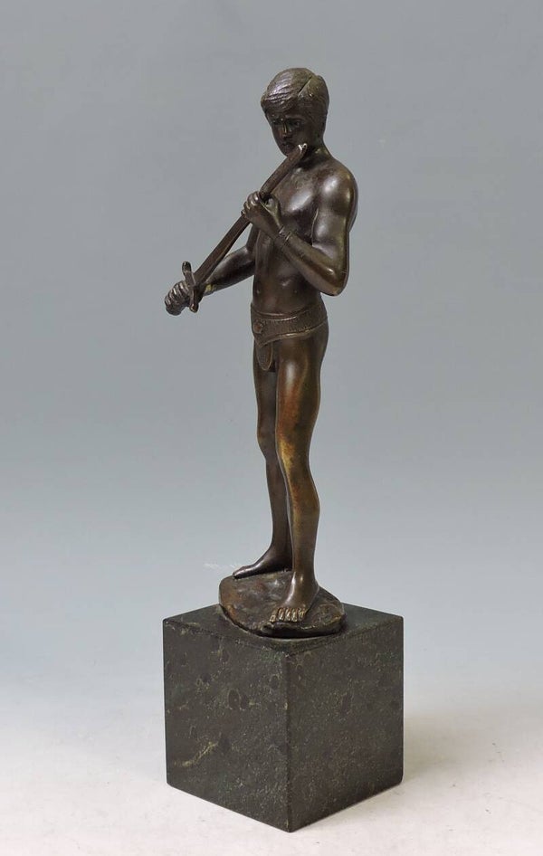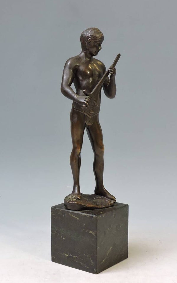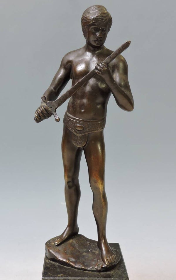 Seltene, alte Bronzefigur in Form eines Schwertkämpfers. Die um 1900 entstandene Arbeit ist ein Entwurf von Alfred Moret aus Frankreich. Der auf einem würfelförmigen Marmorsockel platzierte Krieger ist sehr schön ausgearbeitet und beeindruckt mit seiner Ausdrucksstärke. Das Meisterwerk ist mit Sockel 27 cm hoch und der Sockel hat die Maße 6,5 cm x 6,5 cm x 6,5 cm. Die Signatur am Sockel ist leider nur zu erahnen. Sehr guten Zustand, keine Beschädigungen oder Ähnliches.