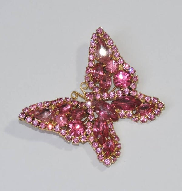 Tolles Vintage Strassbrosche in Form eines Schmetterling mit Rosafarbenen Steinen. Gefertigt in den 1950 / 60 Jahren. Die Brosche ist 6 cm breit und 5 cm hoch.