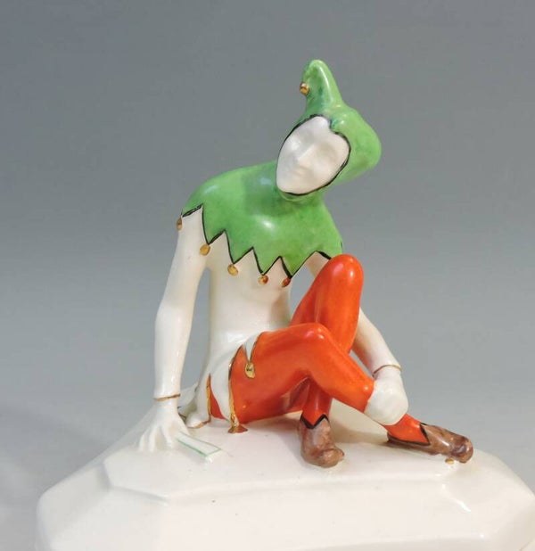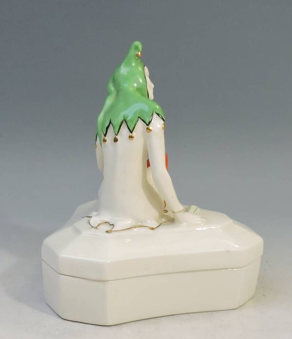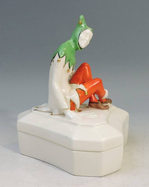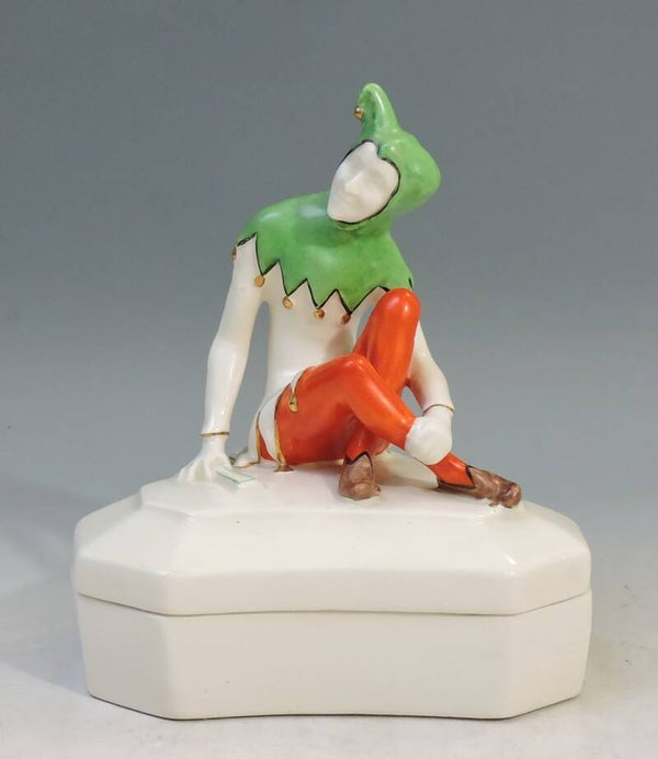Traumhafte Art Dèco Deckeldose mit einem sitzendem Harlekin auf dem Deckel aus der Tschechischen Keramik Manufaktur von Eduard Eichler, Dupowa, Royal Dux in Böhmen. Wunderschöne und sehr gut erhaltene Dose aus der Zeit um 1920. Gemarkt mit Royal Dux Stempel aus der Zeit zwischen 1918-38, sowie Modellnummer 15925. Höhe beträgt 17 cm und Breite 13,5 cm.