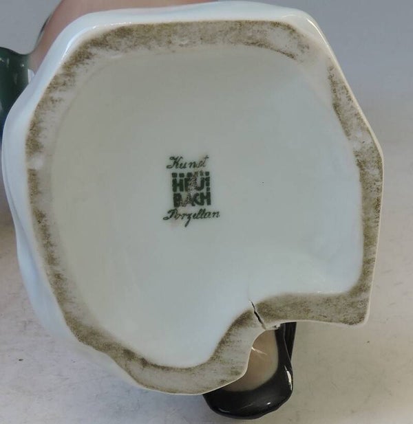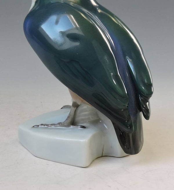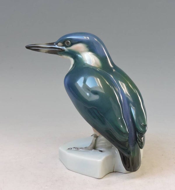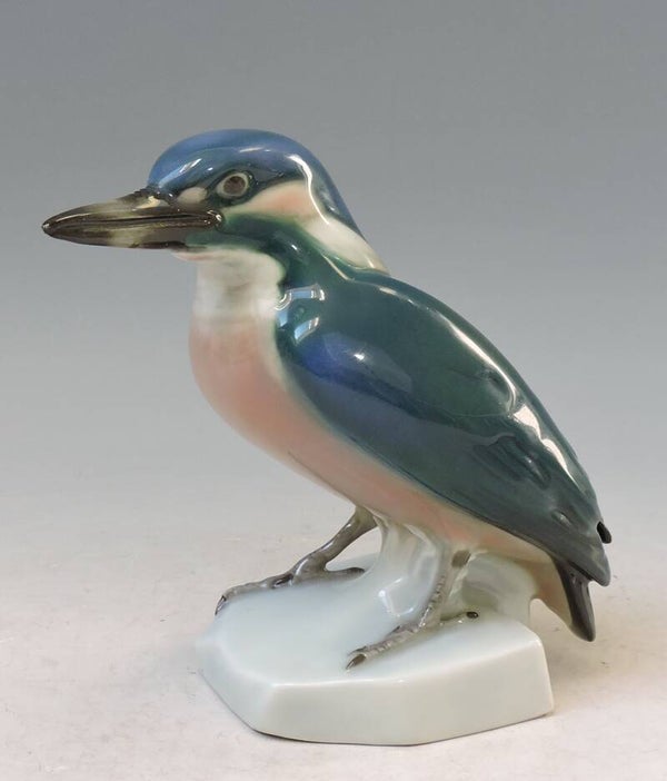 Seltene Darstellung eines Eisvogels aus dem Hause Heubach. Auf flachem Sockel stehender Eisvogel in wunderschönen Naturgetreuem Farben bemalt. Ein Entwurf von Paul Zeiller um 1910 mit der Modellnummer 7526. Traumhafte Jugendstil Plastik in tadellosem Zustand (ein Herstellungsbedingter Brandriss am Sockel (siehe Foto)). Gemarkt mit dem grünem Heubach Stempel mit Schleifstrich und Prägenummer 3, sowie Künstlersignatur P.Zeiler im Sockel. Höhe beträgt 14cm, Länge 16cm.