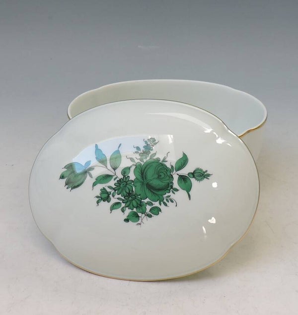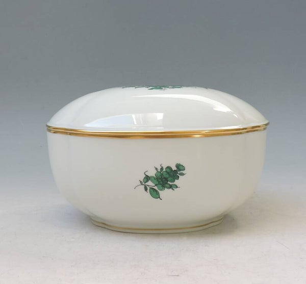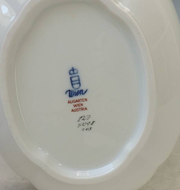 Traumhafte große Deckeldose der Porzellanmanufaktur Augarten in Wien. Die Form des Porzellan nennt sich Mozart mit der Formnummer 62 und das Dekor Maria Theresia mit der Dekornummer 5098. Gemarkt mit Wien Augarten Stempelmarke, sowie Modell- und Dekornummer und Malernummer. Die Dose befindet sich in sehr gutem Zustand. Höhe beträgt 10 cm.Breite 12 cm und Länge 16 cm.