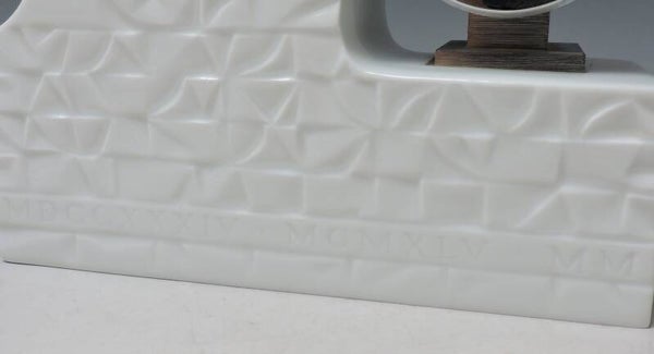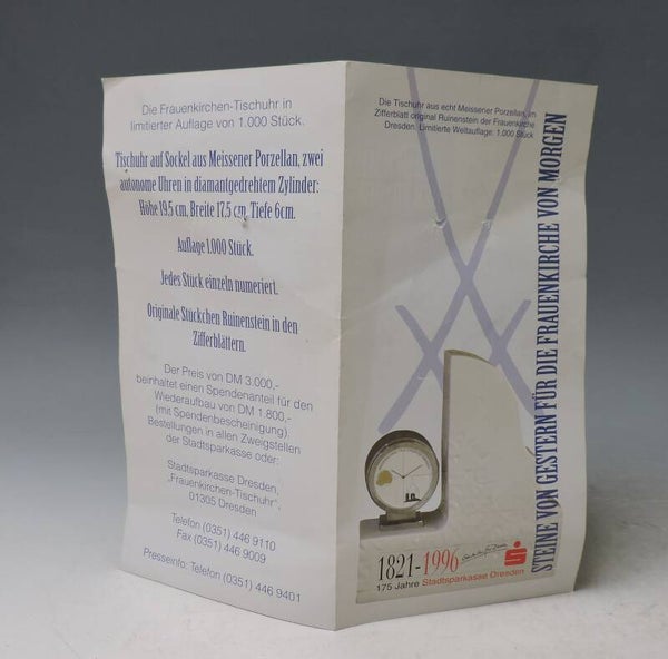 Traumhafte Tischuhr – Frauenkirche aus der Meissener Porzellan Manufaktur. Die Uhr wurde in einer Auflage von 1000 Stück (dieses Stück hat die Nummer 100) von der Stadtsparkasse Dresden für den Wiederaufbau der Frauenkirche verkauft. Ein Entwurf von Jörg Danielczyk mit der Modellnummer 53796. Das gute Stück ist aus weißem Porzellan, beidseitig mit Quarzuhr in Edelstahl. Beidseitig auch das Sandsteinsplitter der Frauenkirche. Die hat eine Höhe von 20cm , Breite 17 cm und Tiefe 6,5 cm. Sehr guter Zustand, ohne Beschädigungen. Gemarkt mit blauen Schwertern, der 1. Wahl, sowie Modellnummer und Zusatz Stadtsparkasse Dresden.